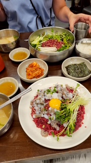 チヂミ(写っていませんが)                ユッケとタコ(タコがくねくね動いてます)