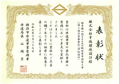 横浜市水道局様より、水道事業の委託業務の実施において多大な貢献をしていただいた受託者を表彰されるものです。